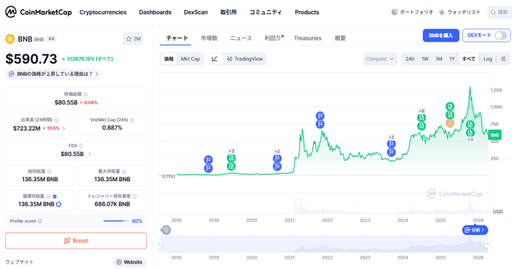 BNBは長期で見ると大きく成長してきた銘柄です。2026年4月5日時点で、1BNB=約590ドル(約94000円)、時価総額ランキングは4位をつけています(CoinMarketCap参照)。直近では高値圏から調整しているものの、依然として主要アルトコインの中核に位置しています。