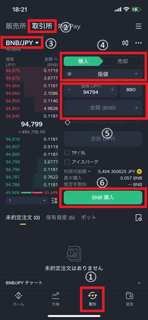 ここでは例として、バイナンスジャパンアプリの取引所サービス(板取引)でBNBを購入する手順を紹介します。