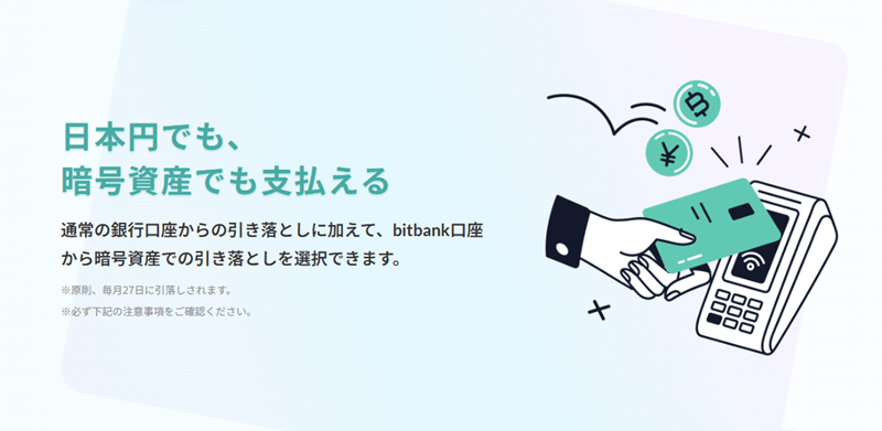 そのため、利用代金の引き落しにおいて「暗号資産取引所(bitbank)」を選択すると、「金融機関」(日本円での引き落とし)を選択した場合よりも割高な支払いとなります。