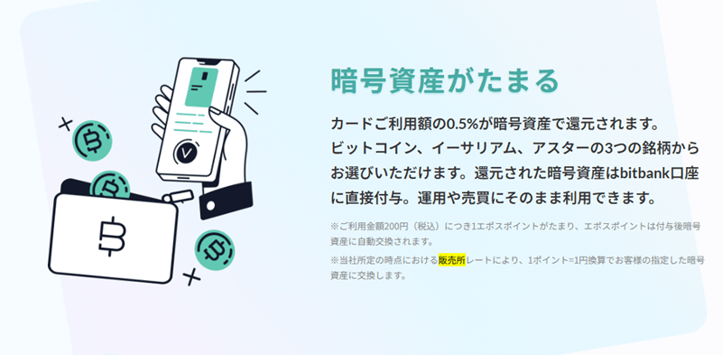 エポスクリプトカードfor bitbankは、仮想通貨取引所の資産から引き落としができる日本初のクレカではありますが、仮想通貨による引き落としと還元は販売所サービスのレートで行われる点には留意する必要があります。