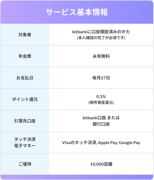 また、年会費は永年無料、国際ブランドはVisaのみです。同クレカの発行・利用にはbitbankで口座開設を行う必要があります。