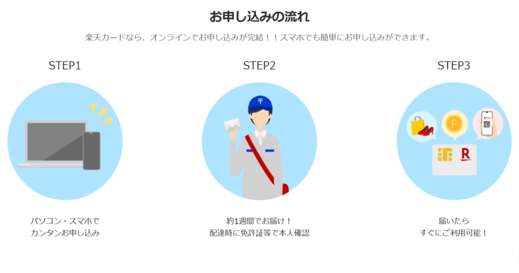 楽天カードの申し込みから利用するまでの流れは以下の通りです。オンラインで簡単に申し込みが完結します。