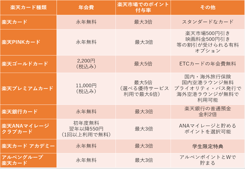 その他、任意で利用料を支払うことでお得なカスタマイズ特典がもらえる「楽天PINKカード」、年会費は発生するもののポイント付与率や付帯サービス等が魅力の「楽天ゴールドカード」「楽天プレミアムカード」などがあります。