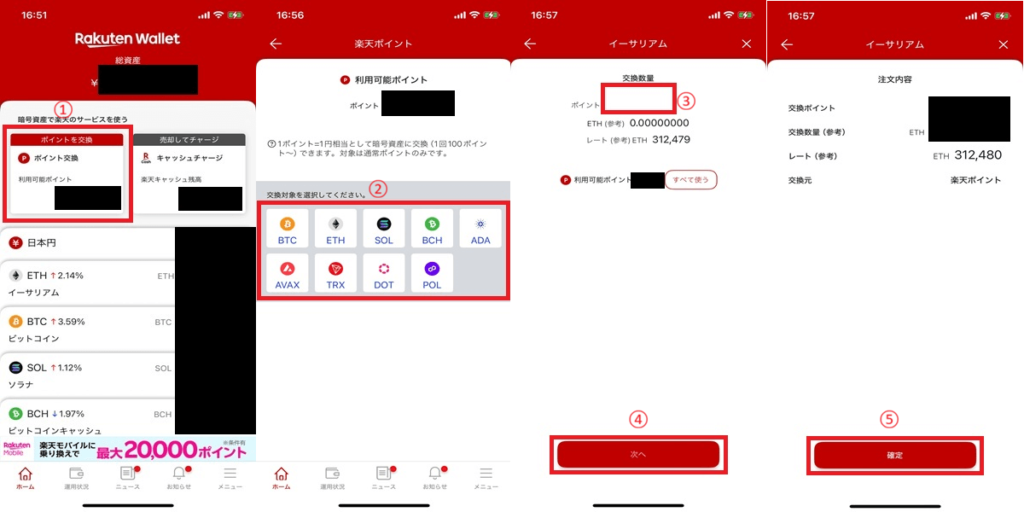 以下は、楽天カードの利用等で貯めた楽天ポイントを楽天ウォレットのアプリで仮想通貨と交換する手順です。下掲の画像を確認しながら操作するとよりスムーズでしょう。